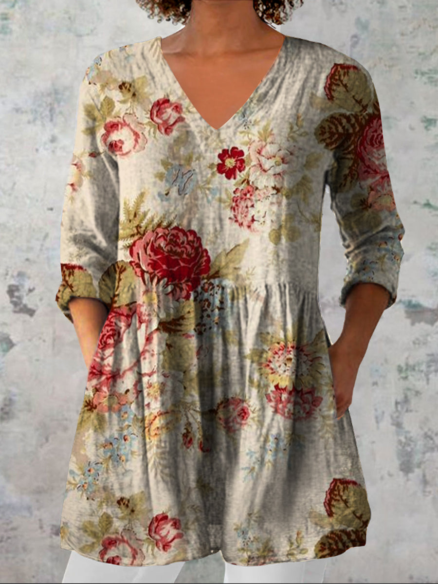 Women's Vintage Floral Art Print Casual V Neck Three Quarter Sleeve Elegant Cotton Linen Top
